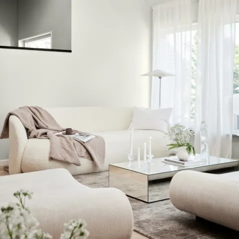 Välj hellre en varm vit nyans även till väggarna. Vill du bryta av något är det fint att matcha vitt till en ljusgrå kulör. Det skapar skiftningar men blir fortfarande en bra bas som är lätt att inreda.