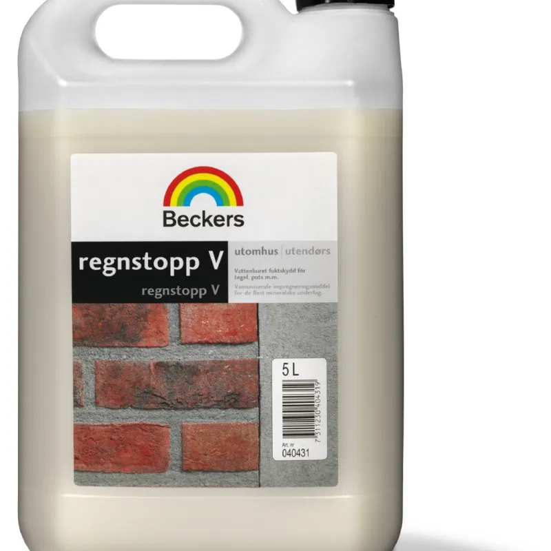 Ett gott skydd mot vatten lönar sig i längden. Beckers Regnstopp V är ett impregneringsmedel som effektivt stoppar ytans förmåga att suga upp vatten när det regnar samt låter fasaden andas ut vattenånga. Med hjälp av Regnstopp V minskar bland annat risken för frostsprängning och det blir lättare att rengöra ytan då det blir svårare för smuts att tränga in i underlaget. Använd Regnstopp V på dina obehandlade sugande mineraliska ytor av till exempel puts, betong eller tegel.
