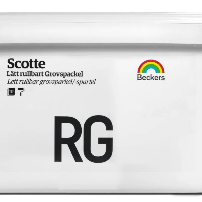 Spar på tid och kraft med rullspackel. Scotte RG Spackel är ett färdigblandat smidigt lätt grovgraderat rullspackel ämnat för bredspackling i tjocka skikt inomhus. Spacklet passar perfekt för spackling av målade glasfiberytor. Spacklet fyller ut ojämnheter mycket bra och ger en jämn och fin grundyta. Scotte RG är mycket lätt att applicera och fördela över ytan med hjälp av en roller – det är bara att öppna locket och börja rulla! Spacklet uppfyller kraven för CE märkning enligt EN 15824.